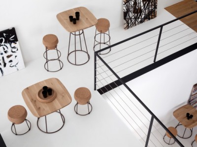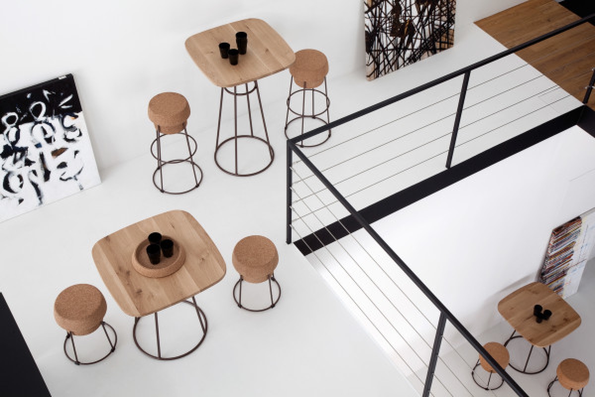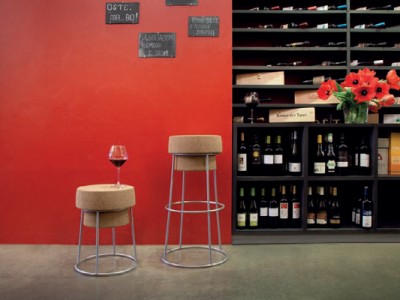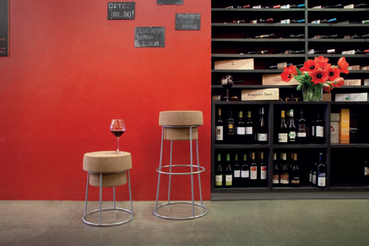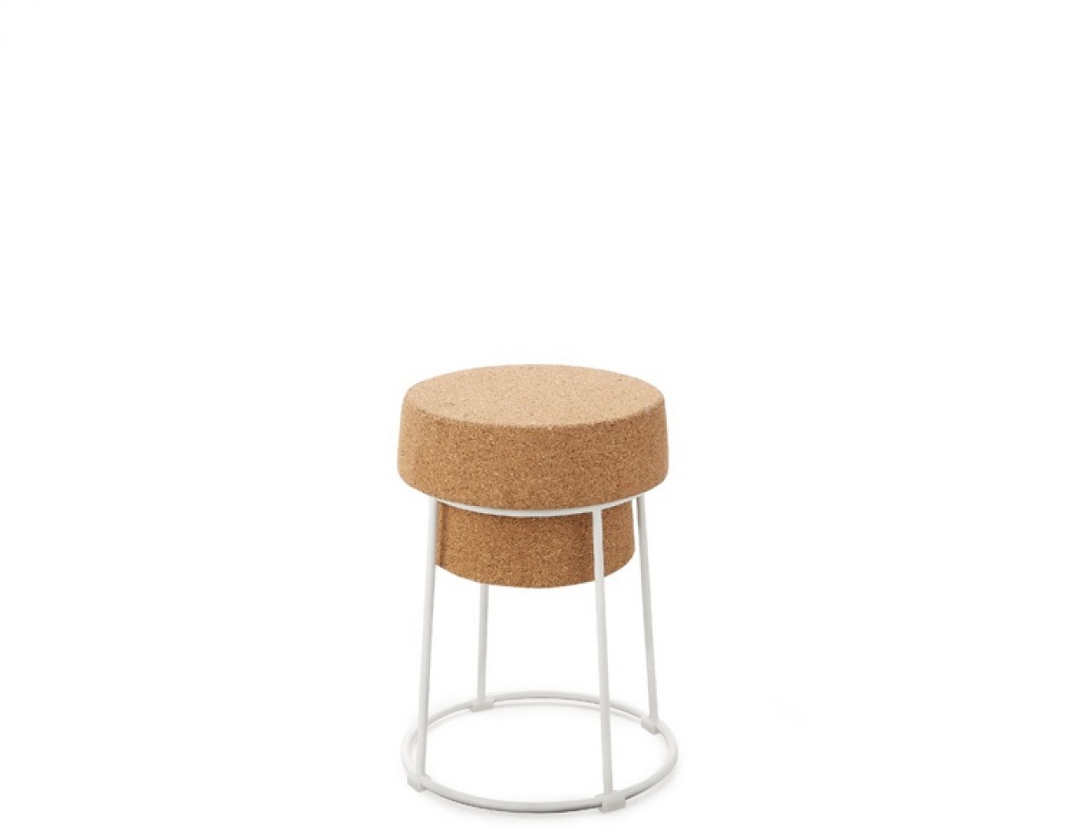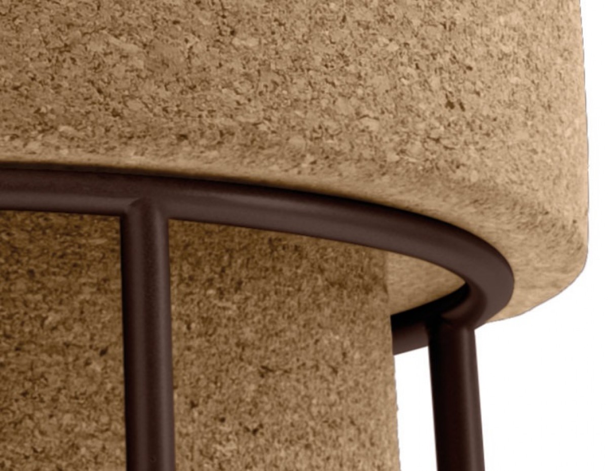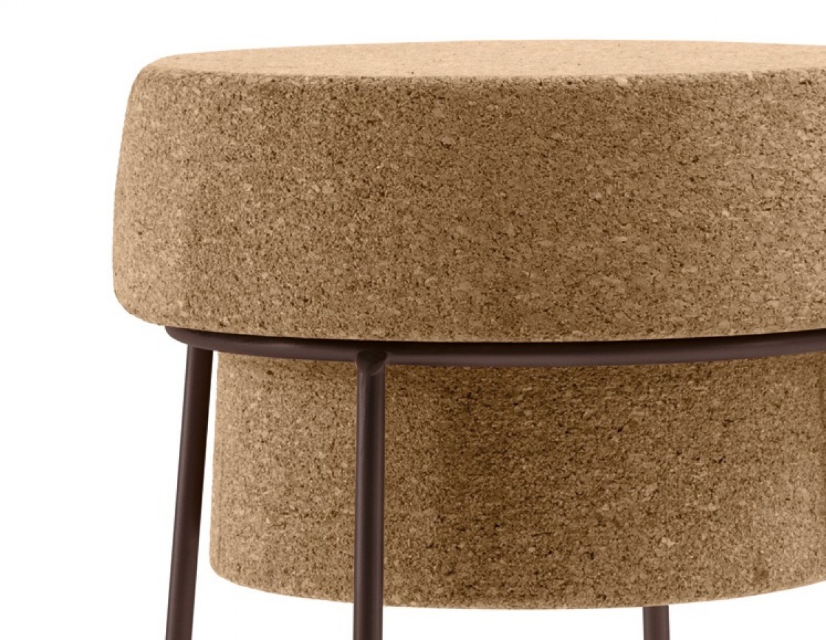 Stool, lacquered steel frame, regenerated cork seat.