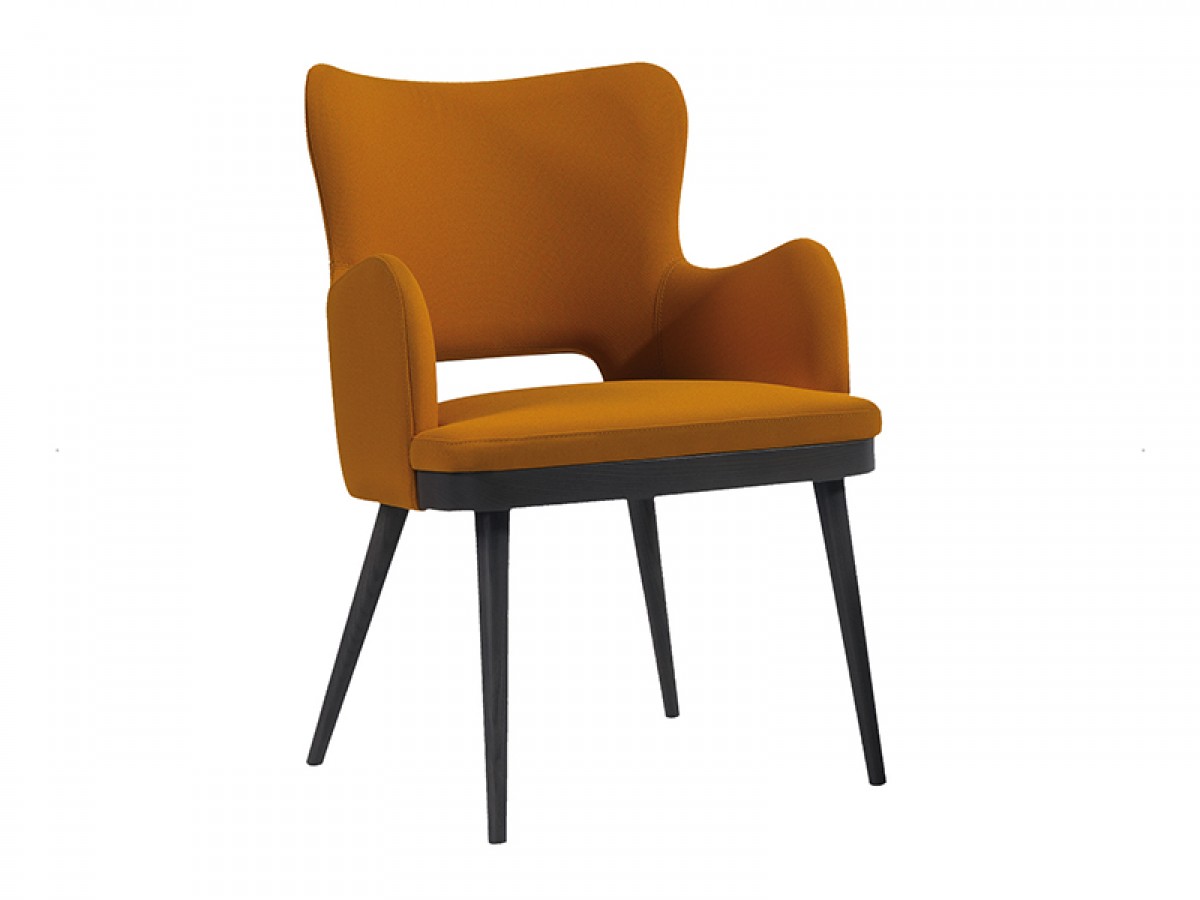• Armchair, with solid beech wood frame, seat and back in fabric or faux leather.