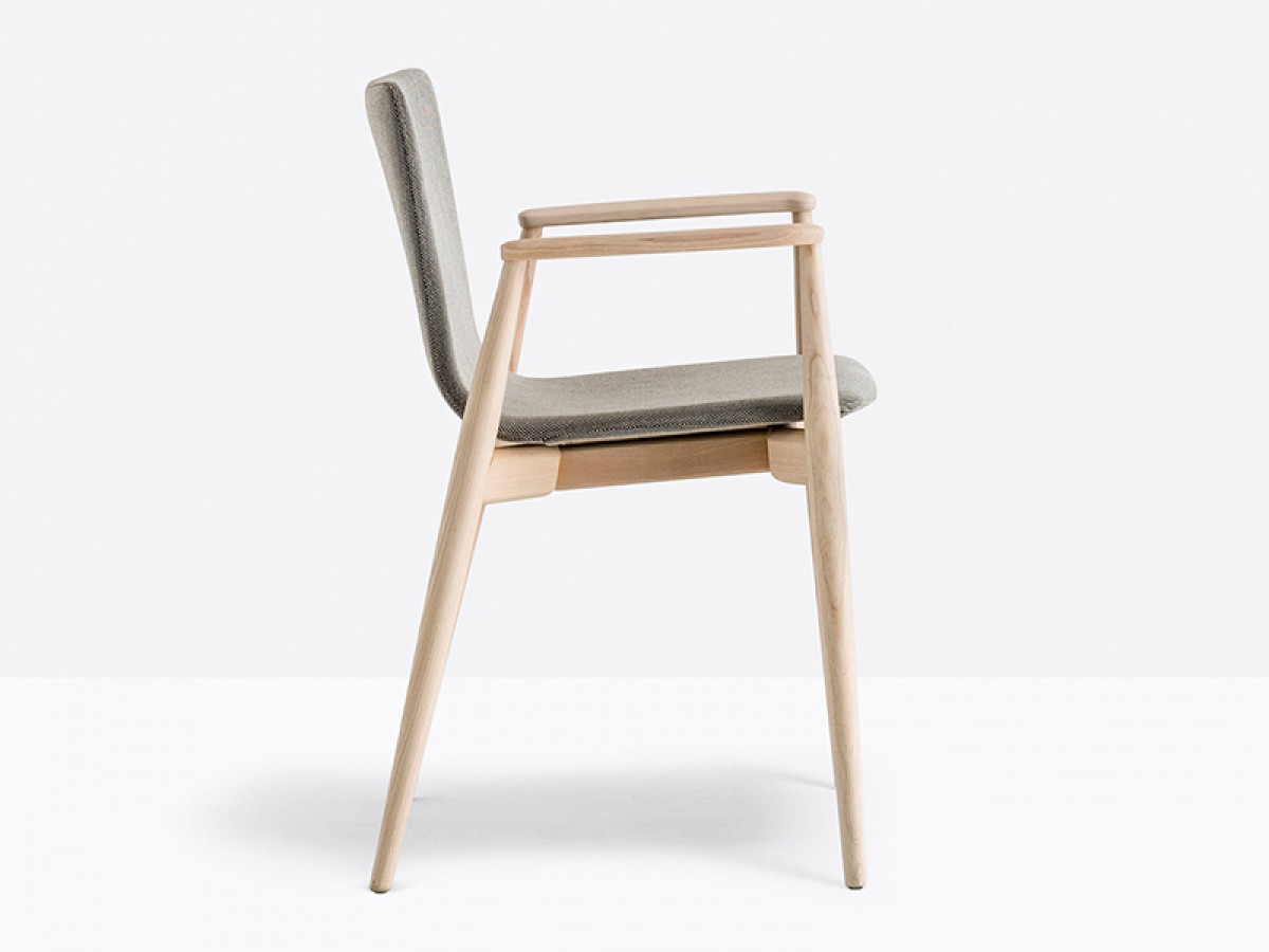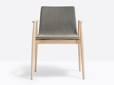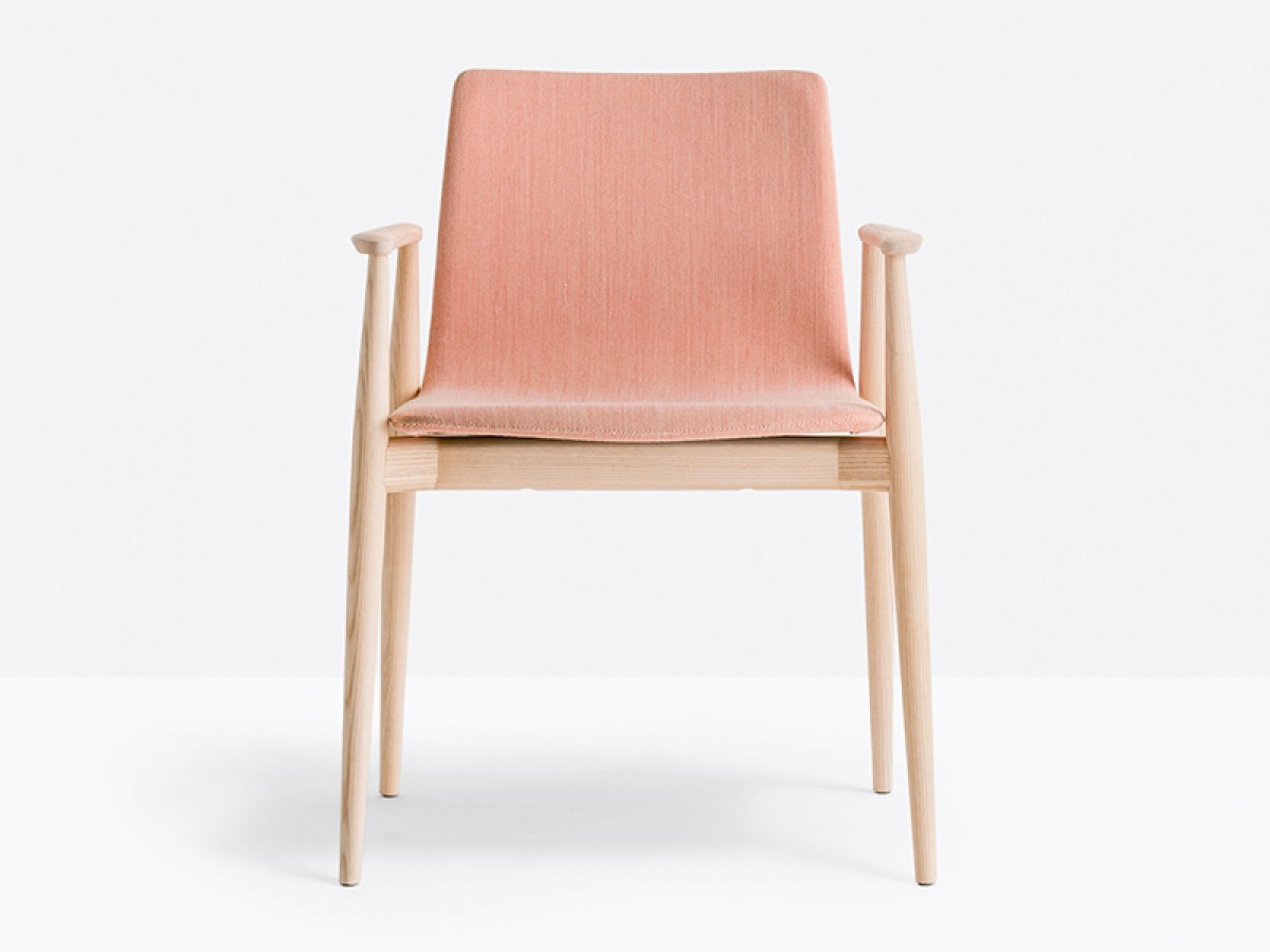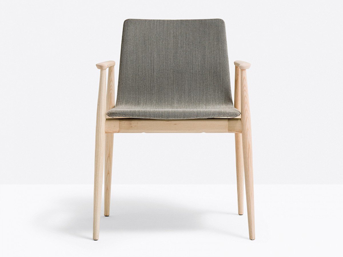 •  Armchair with upholstered shell, solid ash wood frame and armrests.