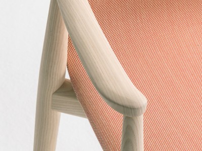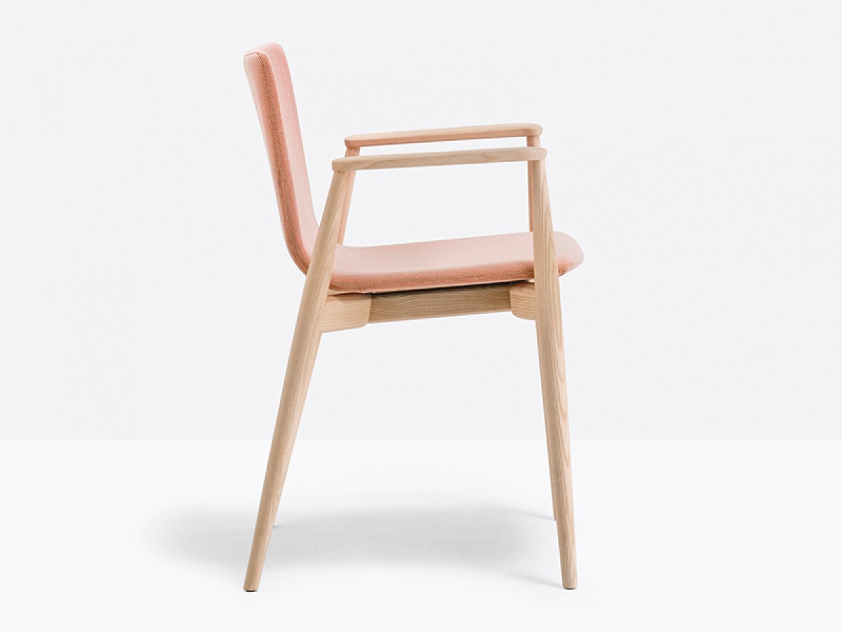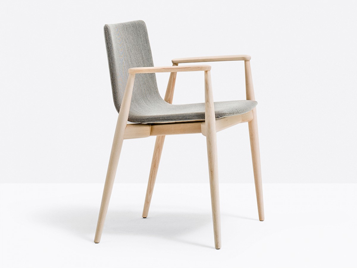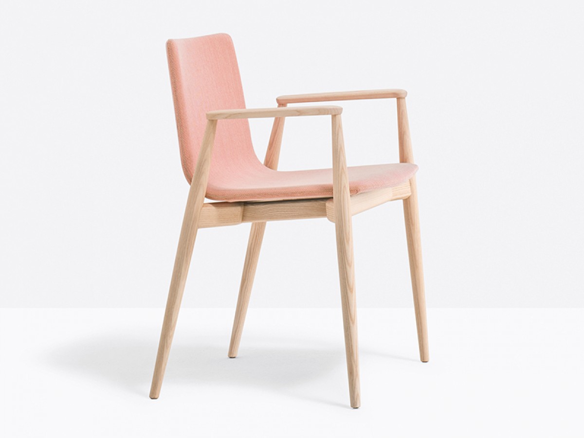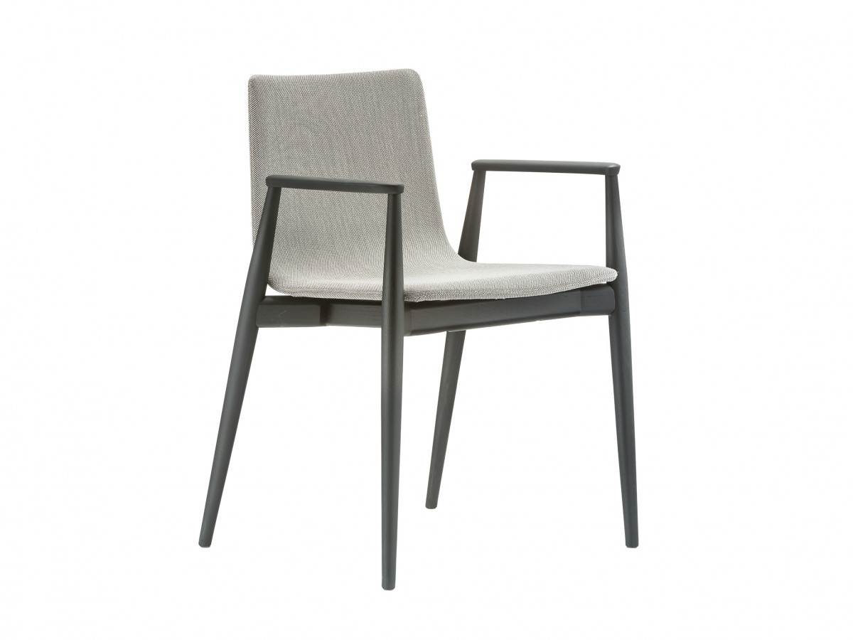 •  Armchair with upholstered shell, solid ash wood frame and armrests.