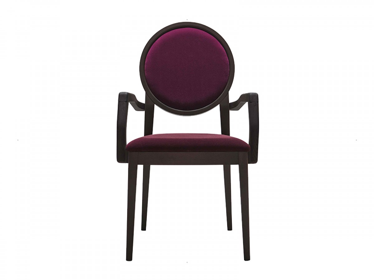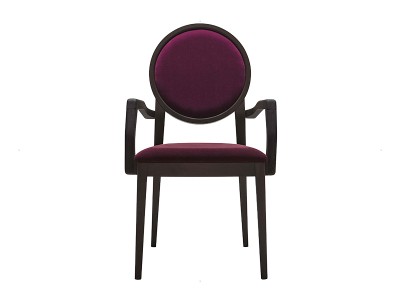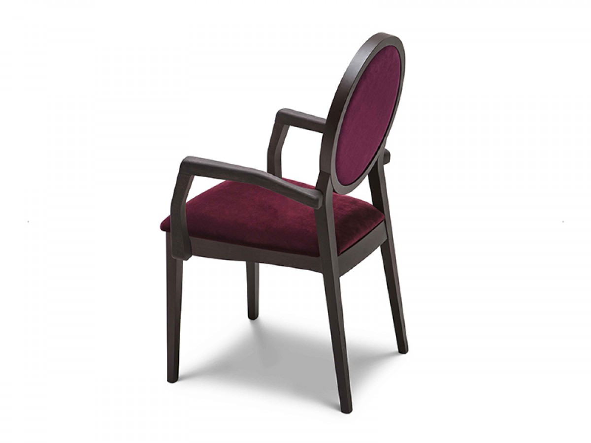 - The upholstered back of Meda armchair is enclosed in a round wood frame which embellishes it, creating an aesthetic continuity with the frame.