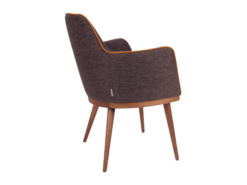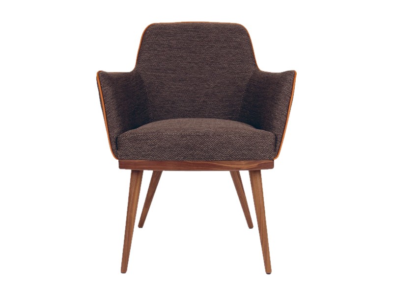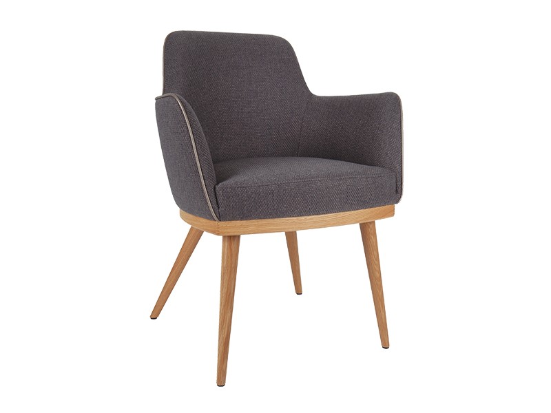 - Upholstered wooden frame chair with arms, with frame available in natural wood or various finishes.