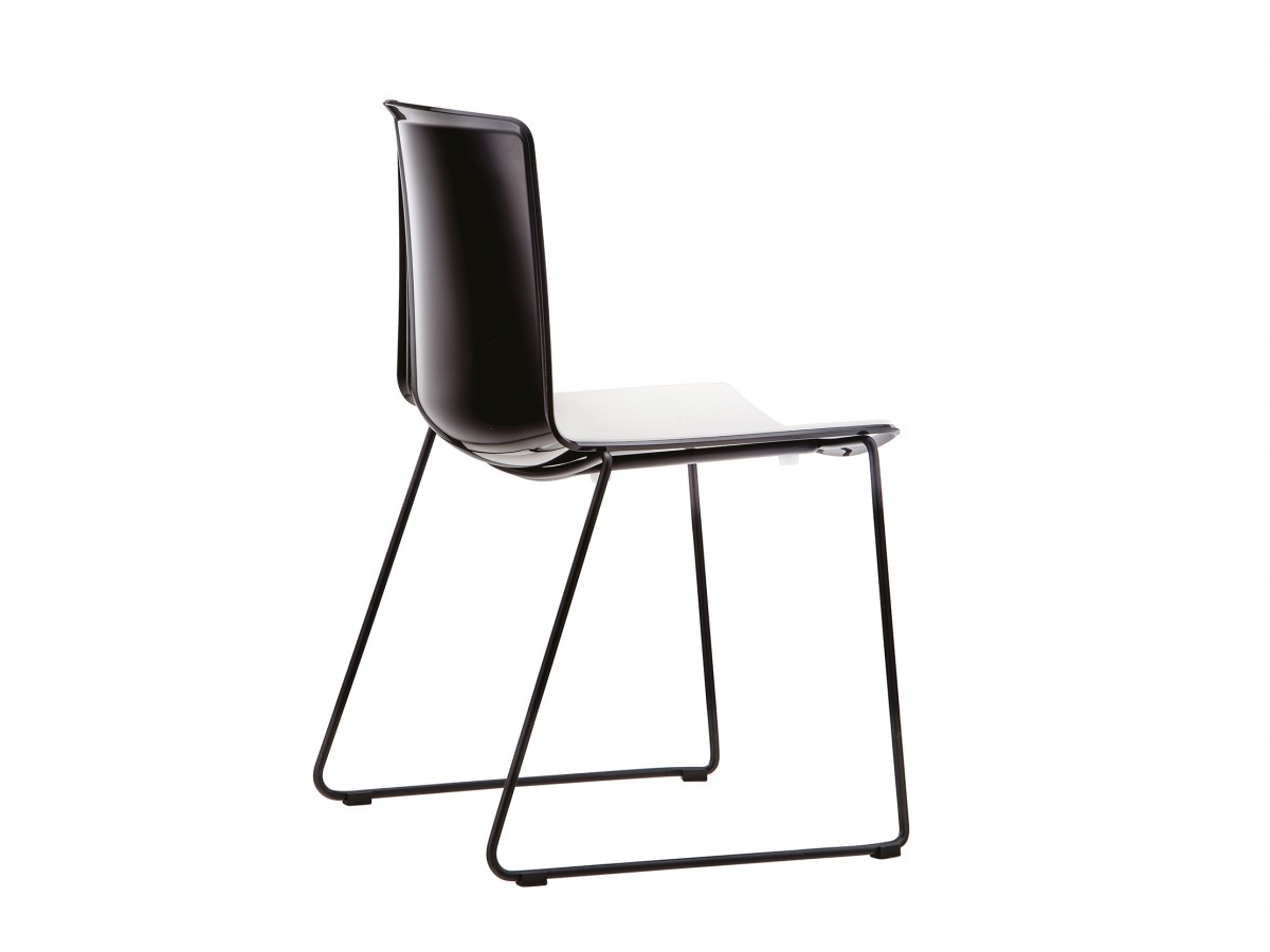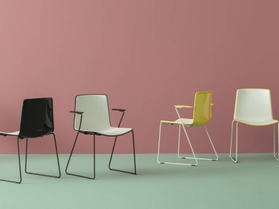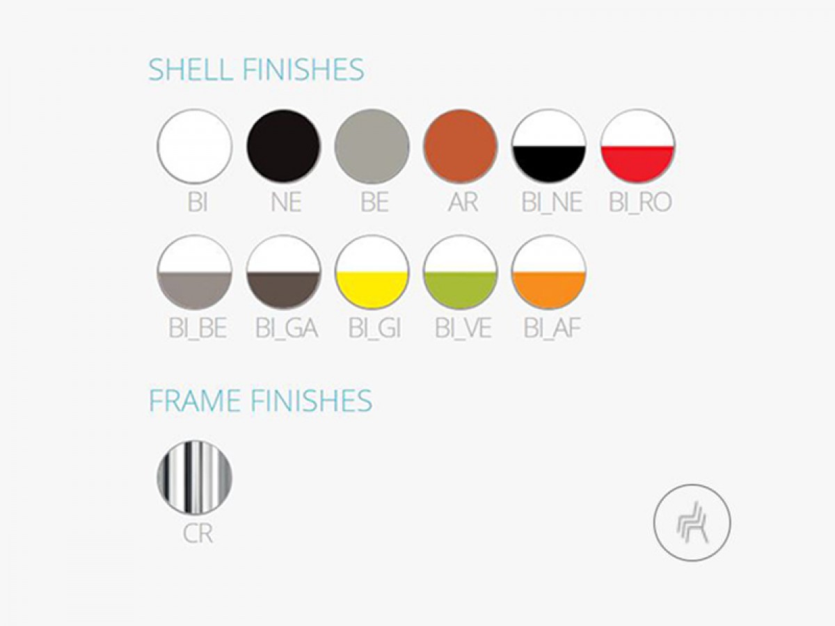 - Bi-injected moulding polypropylene shell with sled frame in steel rod Ø11 mm, chromed or powder coated.