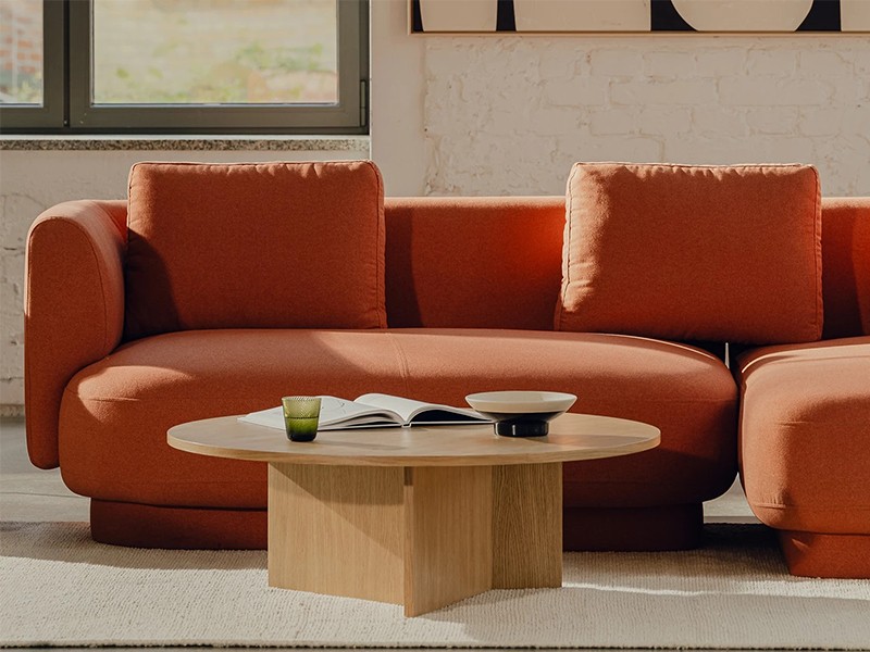 • Soft, loose backrest cushions add to its coziness, while subtle asymmetry emphasizes its uniqueness.