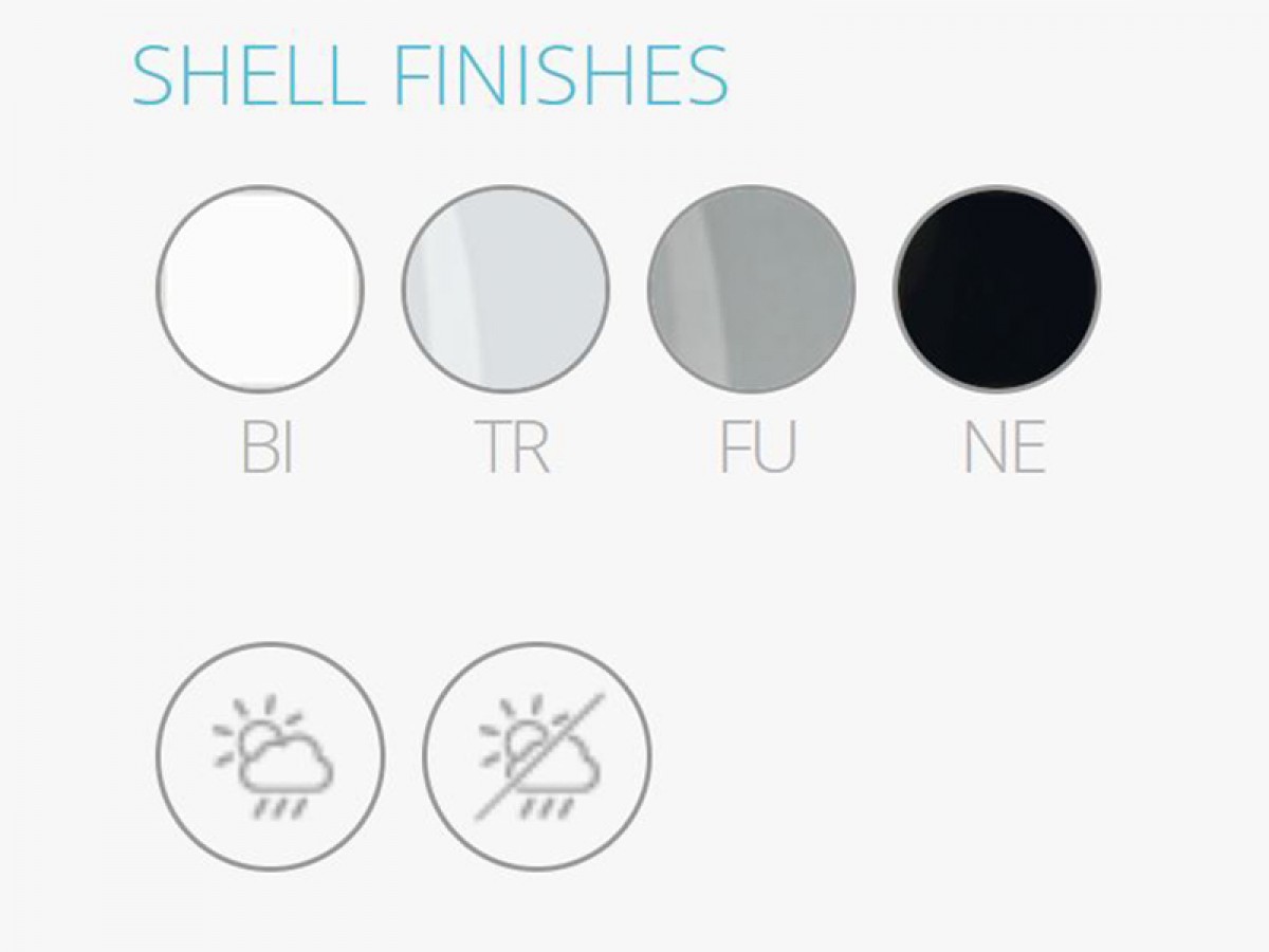 • In polycarbonate, glossy finish. Available colours: white, black, fume and transparent.