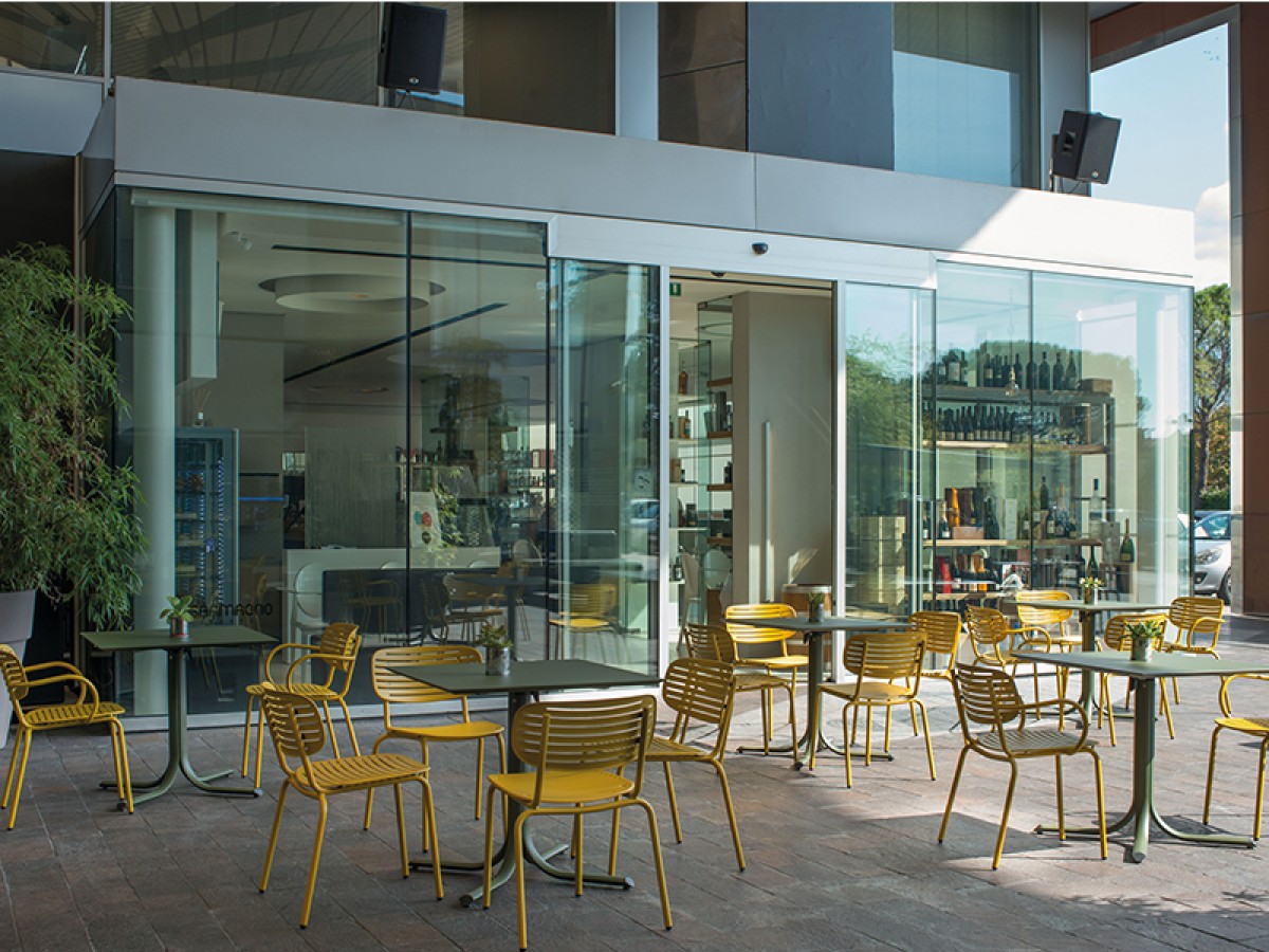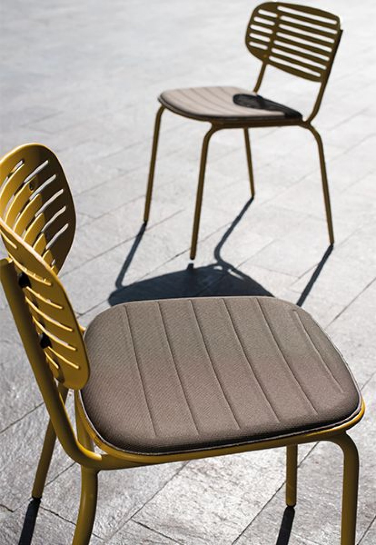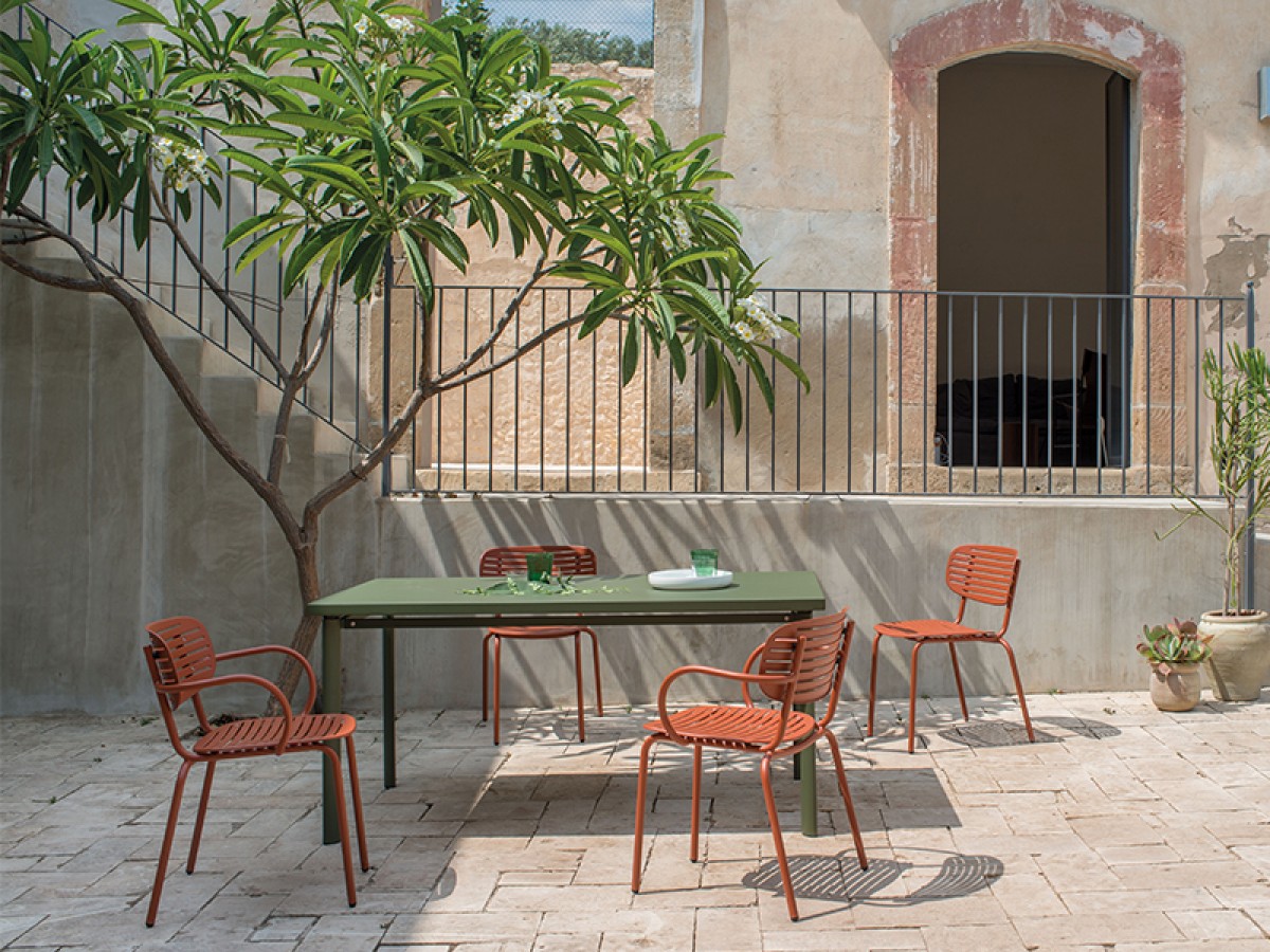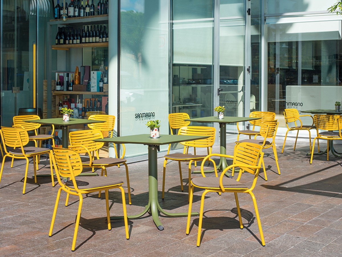 - The structure is made entirely from Fe360 tubular steel, while the seat and back, characterized by the striking graphic design, are in deep-drawn galvanized steel sheet.