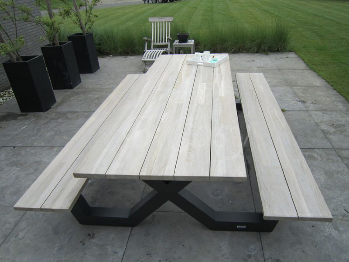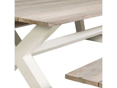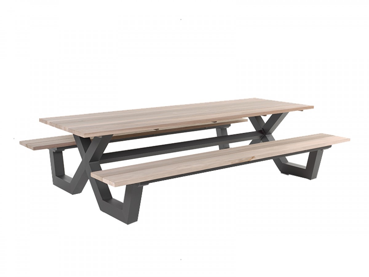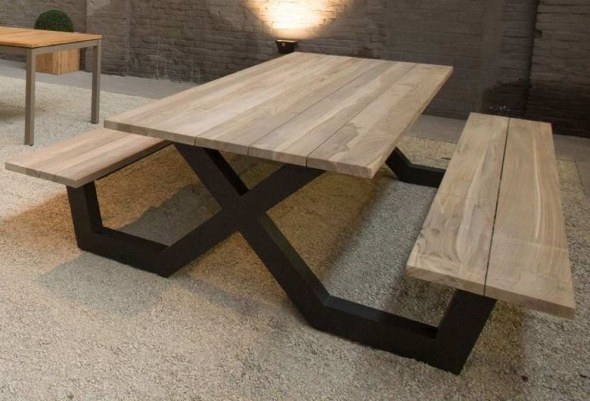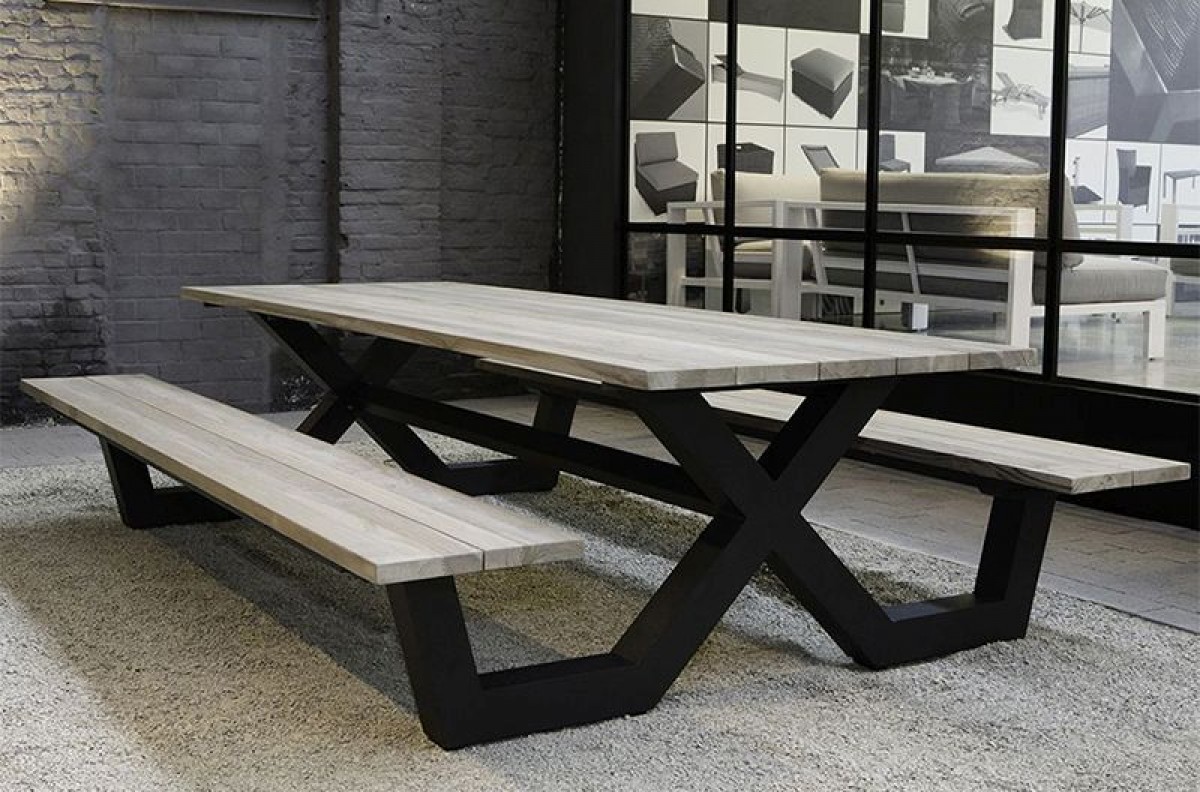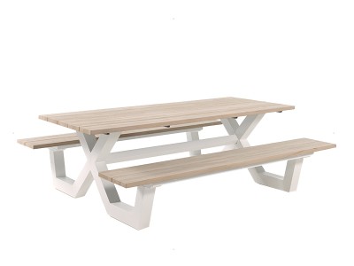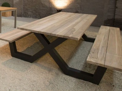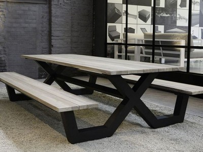 - Outdoor table and bench set, with a strong structure and a distinctive criss-cross design.