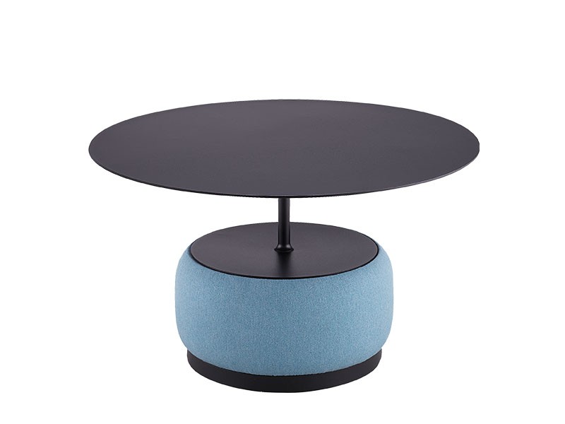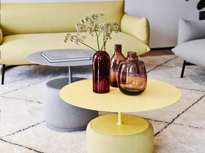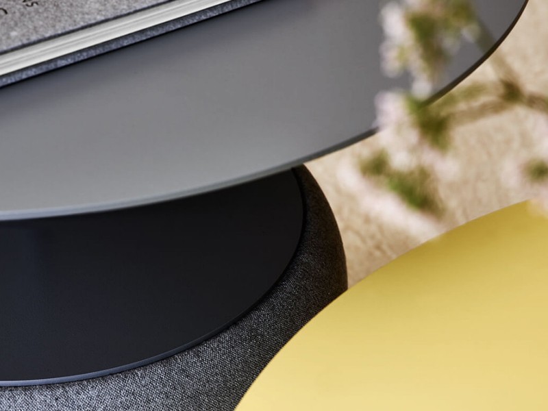• The Bloom coffee table consists of two key components: a unique round base that can be upholstered in fabric, leather, or faux leather, offering sound-absorbing properties.