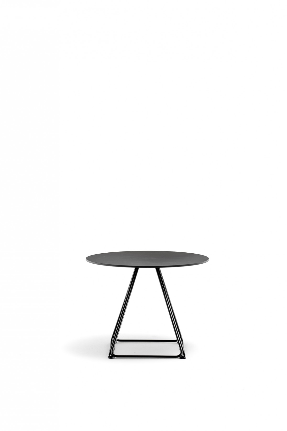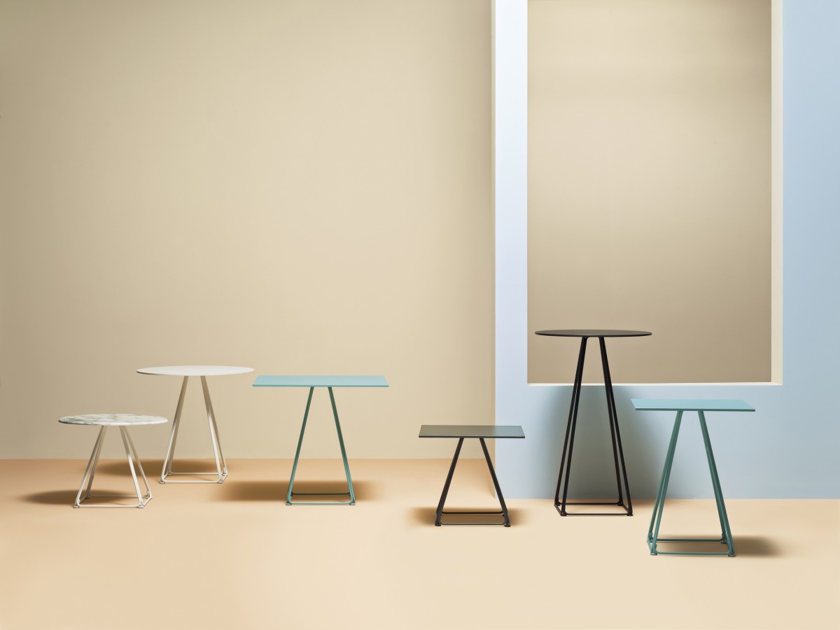 - The base consists of four trapezoidal steel rods and can be combined with tops of different sizes and finishes.
