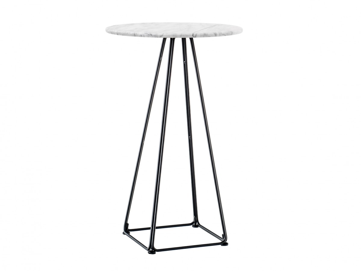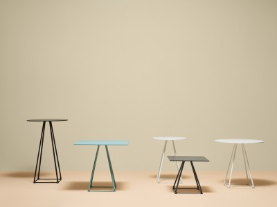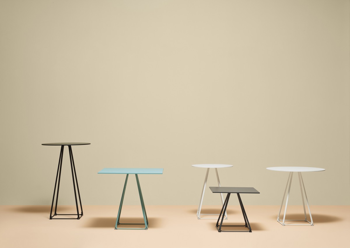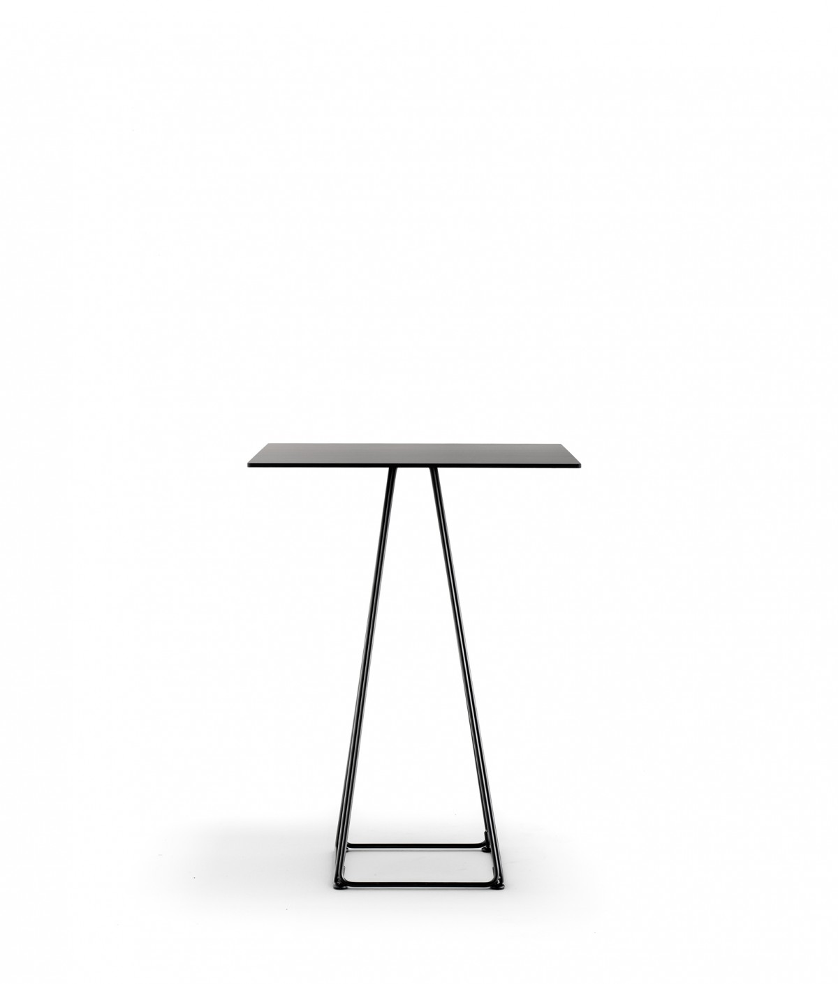 - The base consists of four trapezoidal steel rods and can be combined with tops of different sizes and finishes.