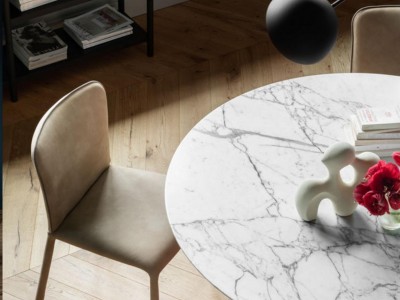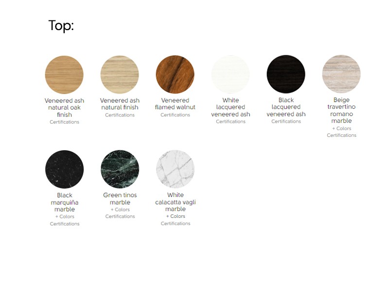 • This table features a central lacquered metal base, providing both stability and a touch of modernity. The round top comes in a variety of luxurious materials, including veneered wood, crystalceramic, and marble. Please note that the ø180 size is not available with a crystalceramic top.