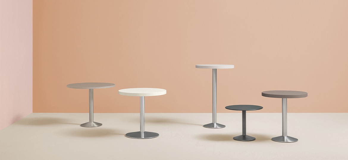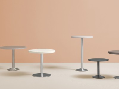 - Table base with sand-blasted cast-iron base and steel column, available combined with tops of different sizes and finishes.