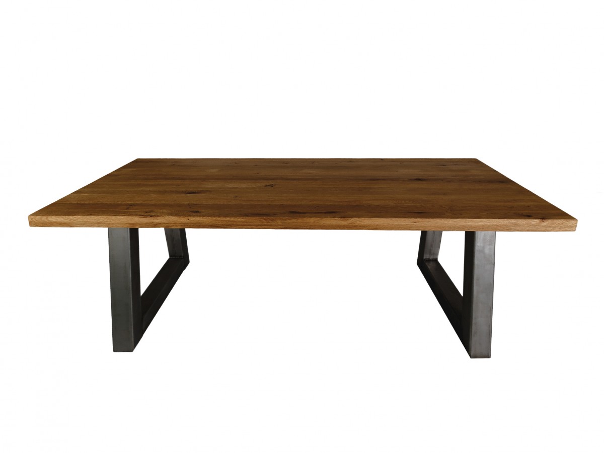 • The table top is made of planed rustic oak planks. The base is made of untreated steel. It is a very sturdy and stable frame in the shape of a trapezoid.