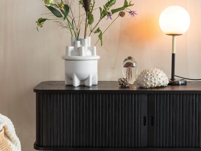 - Top and bottom MDF with veneer, inside panels MDF with foil, legs and tambour solid wood.